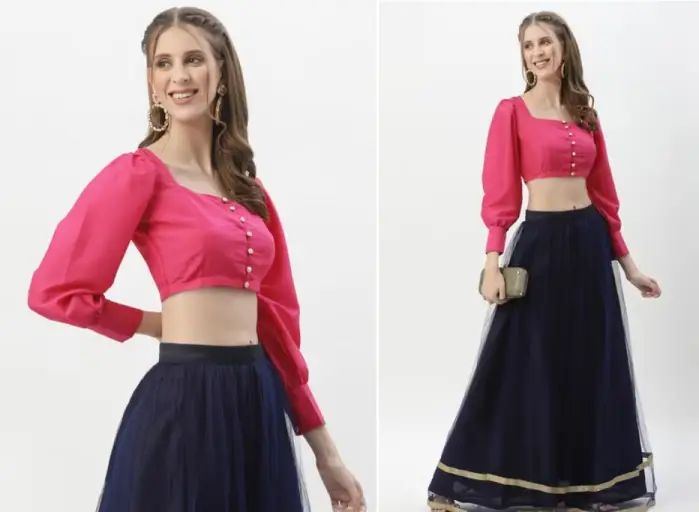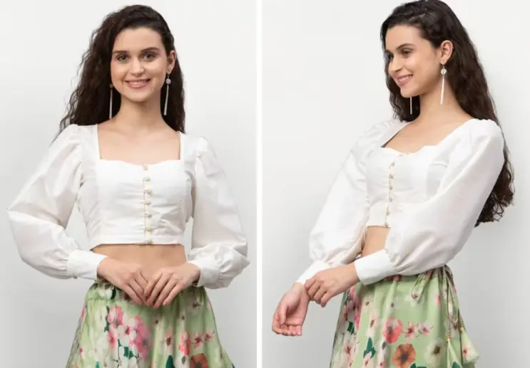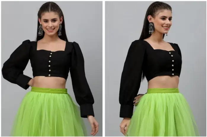 This trend isn’t new; it’s got royal roots from old-timey Europe, but thanks to the world getting smaller, Indian girls now rock it, too! And the wonders these puff sleeves do? Oh, my! They come with different necklines, like deep Vs or fancy boat necks, making things even more interesting. Sparkly things like sequins and tassels add glitter, while embroidery tells stories in flowers and patterns, turning each blouse into a tiny work of art.