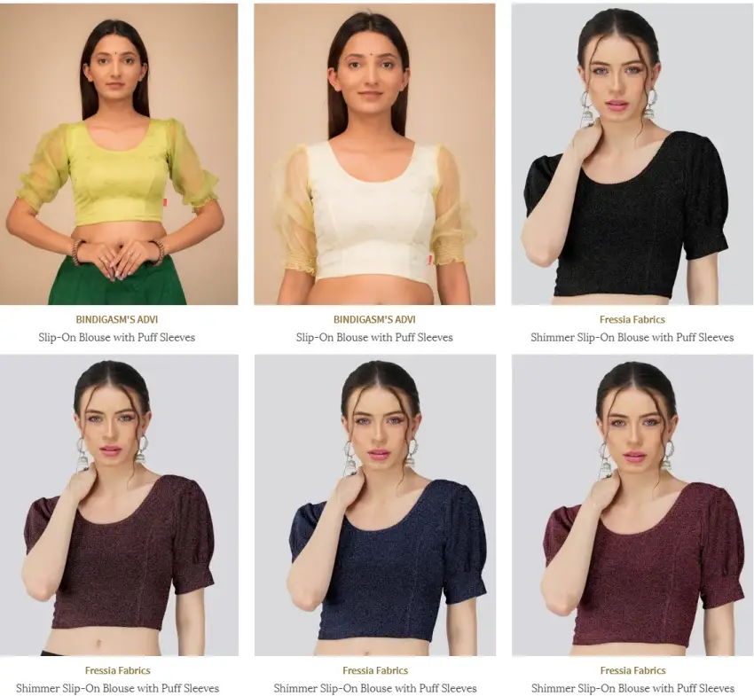 The following puff-sleeve blouses are available in different colours. Click on the images or the links to view them on different eCommerce websites e.g. Amazon, Flipkart, Ajio and Myntra.
