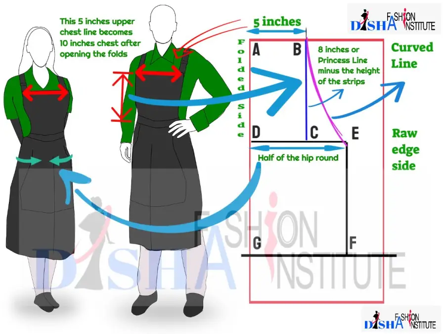 Measure 8 inches vertically downwards from the upper chest mark you have taken in the previous step. Point B to C in the below picture. You can take it 8 inches or 10 inches as per standard. But you can also take a body measurement to make it perfect. This is the length of the princess line minus the height of the strips of the apron. (Note: Princess line is nothing but the length from the shoulder to the waistline.)