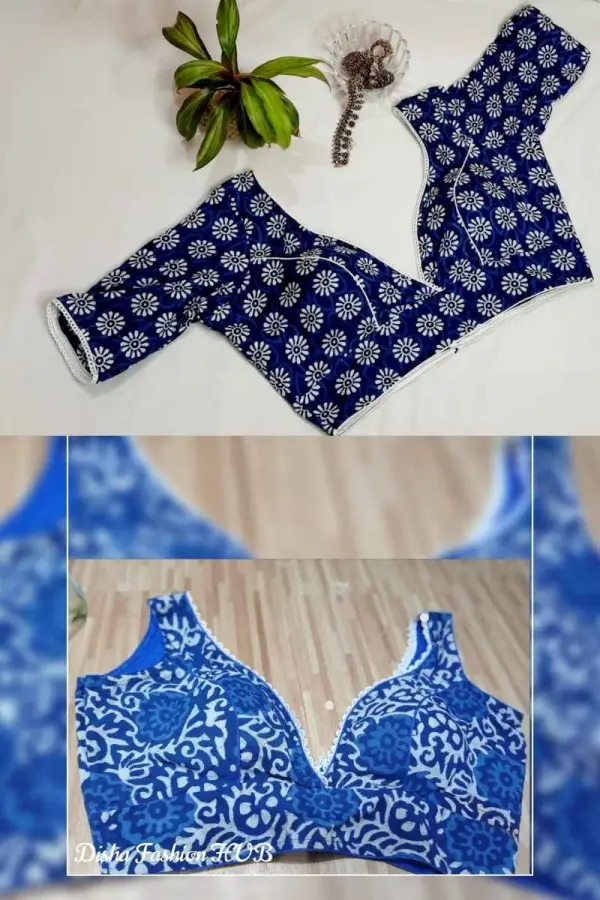 A V-neck saree blouse features a neckline that dips down in the centre, forming a V-shape. This classic and elegant design is incredibly versatile and can be adapted to suit various styles and occasions.